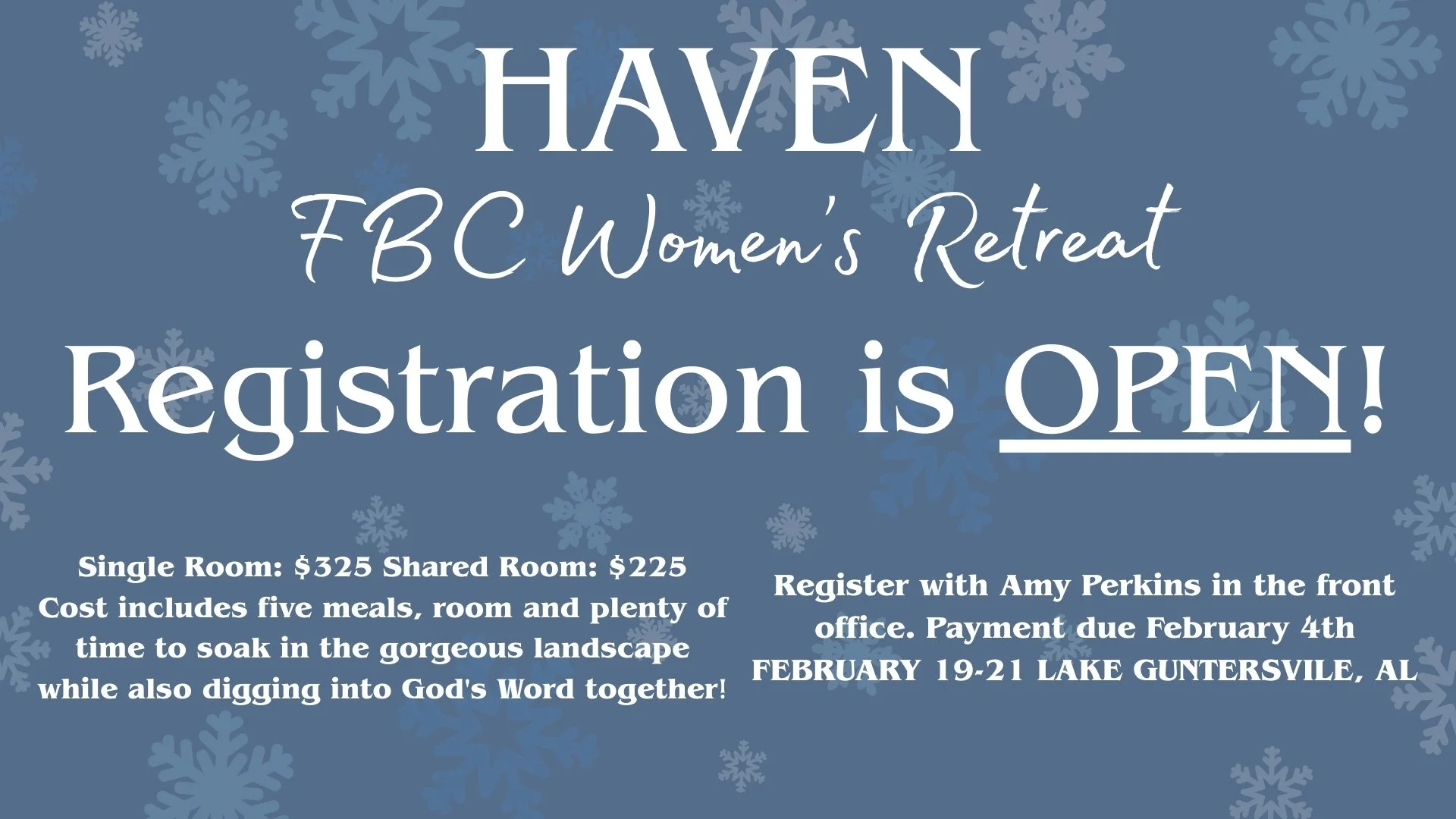 Please register with Amy Perkins at the front office. Payment due February 4th, Retreat on February 19-21st at Lake Guntersvile, AL